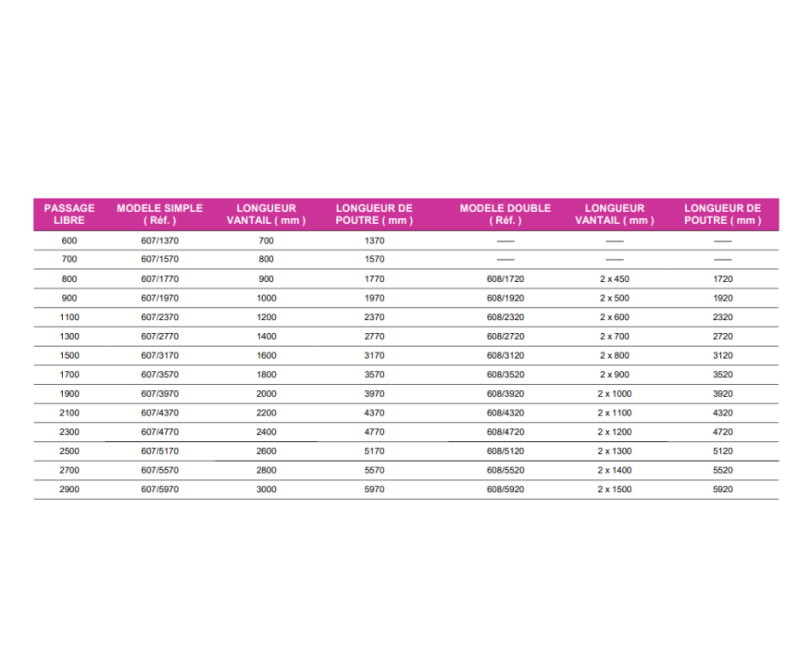 Modèle Vantail Largeur de passage (mm) Poids max. vantail (Kg)
