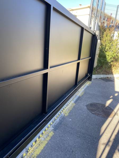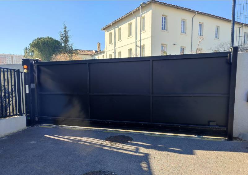 > Installation d'un portail coulissant noir en acier réalisée à Marseille