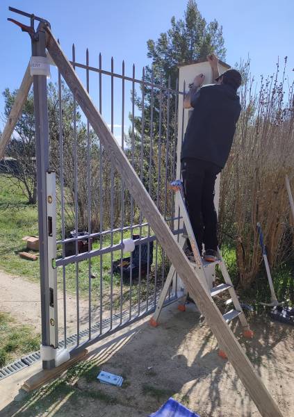 Pose d'un portail acier FERPLAY, modèle A1.1, forme A, en primaire d'accroche grise ( le client souhaitait peindre son portail plus tard), d'une largueur de 3540 mm et d'une hauteur de 2250 mm.