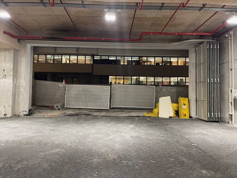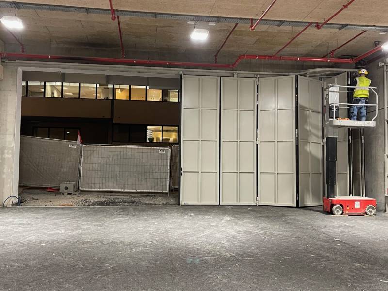 Organe de commande (boutons en façade dans les coffrets) à position instable avec vue directe et permanente sur la totalité du débattement de la porte.
